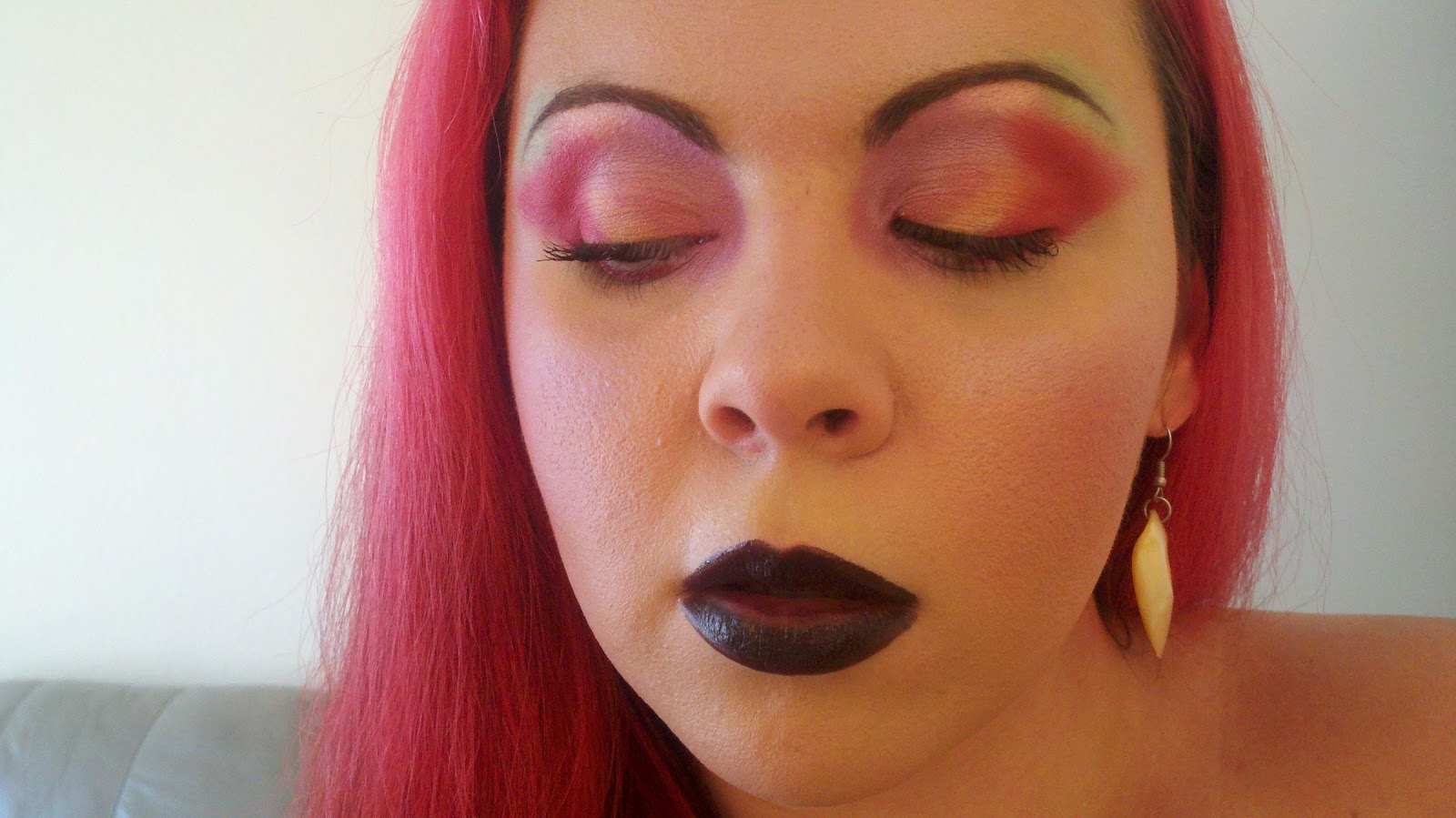 Purple shimmer/hotpink mix on inner area. dark hot pink from CS 88 palette on just the inside of the purple/pink mix on the lower portion of the lid only, brought only to crease. Shimmer yellow/peach from Fash 88 palette as small highlight on lid. Red from Fash 88 palette on outer edge as shown. lets keep going...phew take a breath! lol